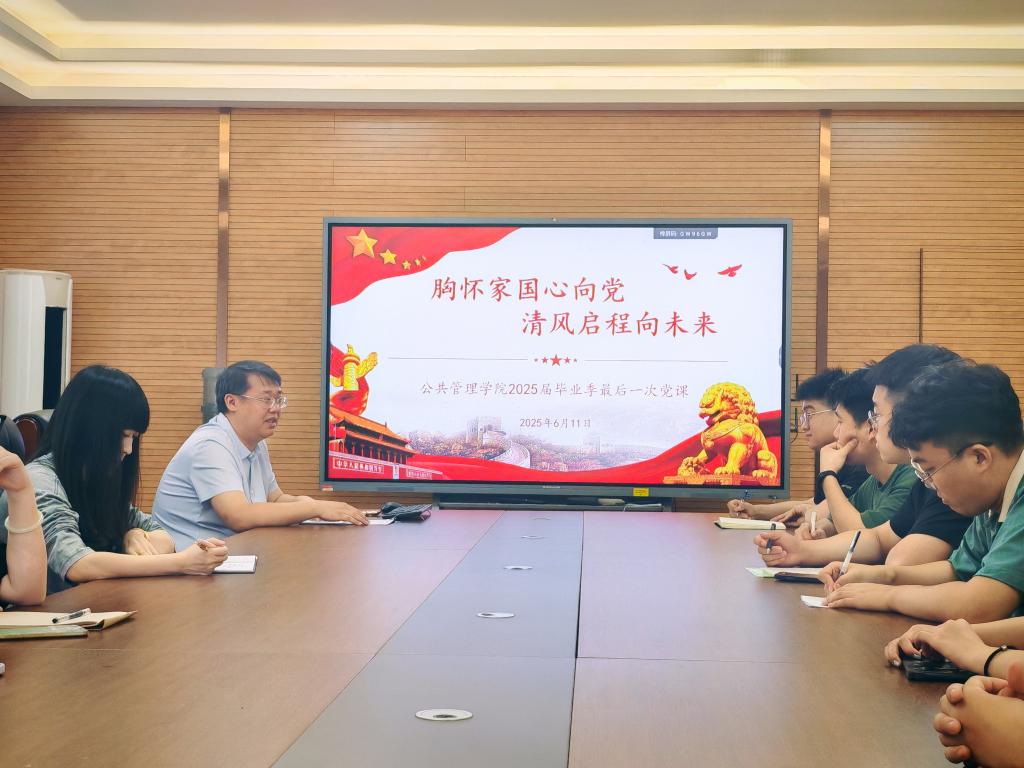 为引导毕业生党员坚定理想信念、顺利实现身份转变,2025年6月11日上午,污污漫画 召集毕业生党员,开展了以“胸怀国家心向党 清风启程向未来”为主题的毕业前最后一次党课。院党委书记何昱主讲,学生支部书记、毕业生党员参加。