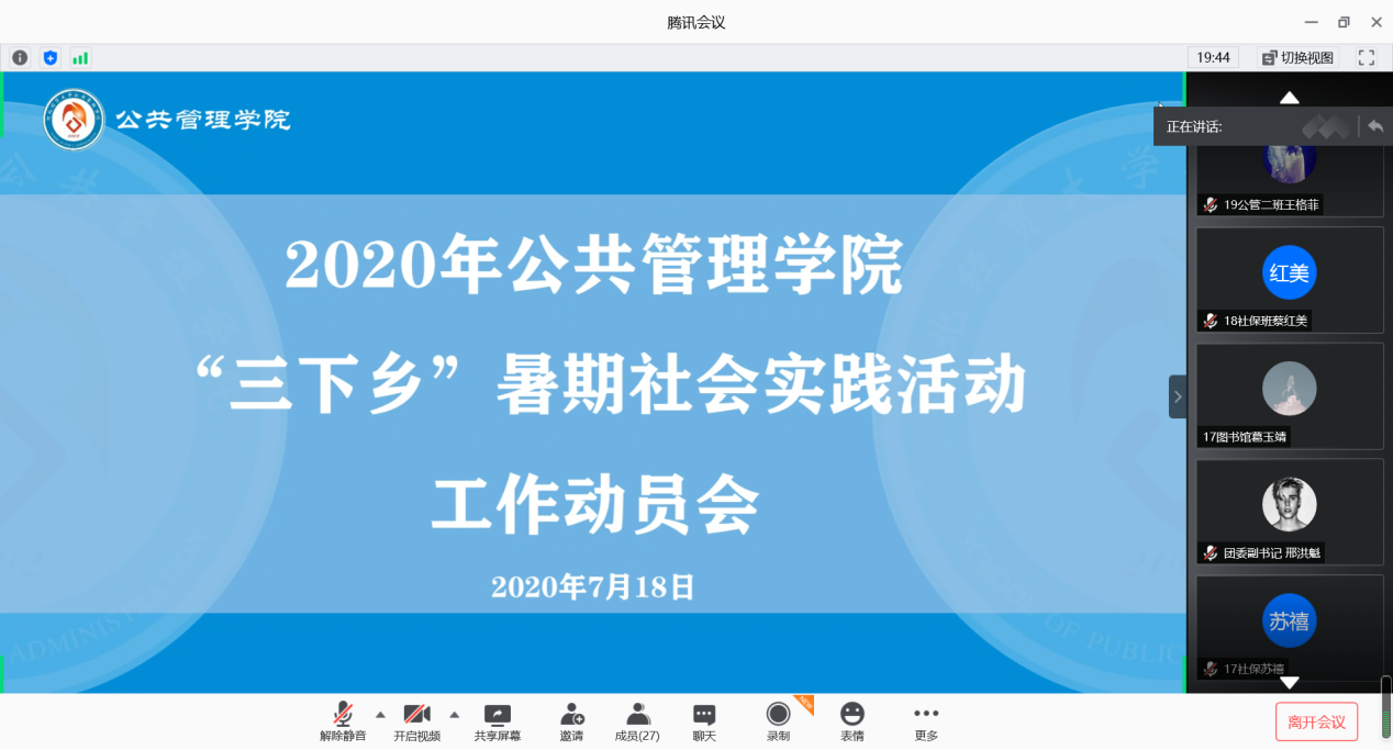 在腾讯会议上召开“三下乡”暑期社会实践活动工作动员会。学院党委副书记孟祥燕出席,学院团委工作人员及2017级、2018级、2019级团支书参加。