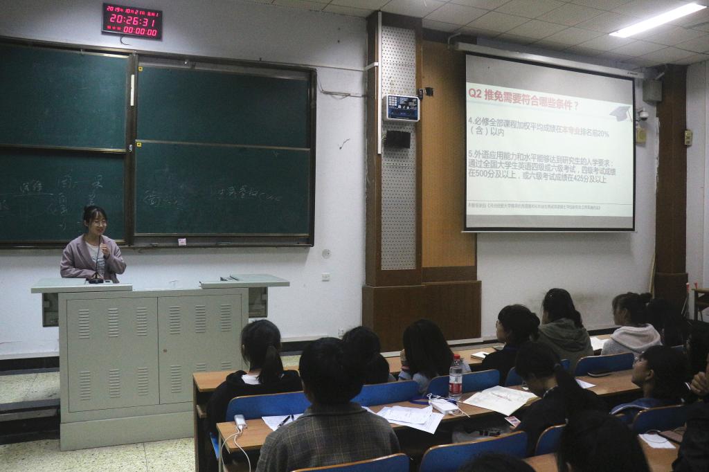 会上,张慧敏通过介绍推免生的条件、申请学校的流程,使同学们对推免政策有了初步的认识。她重点介绍了推免需要达到的学业条件:平均学分绩点2.5以上(含);必修课程加权成绩排名在本专业20%(含);通过四六级考试。宋艳伶就自己大学期间的经历向同学们分享了学习、科研经验,她提出:要提前规划自己的大学生活,平衡好学习与其它活动的关系,把握学生学习主业。会议最后,同学们就自己关心的问题与张慧敏、宋艳伶进行深入交流。