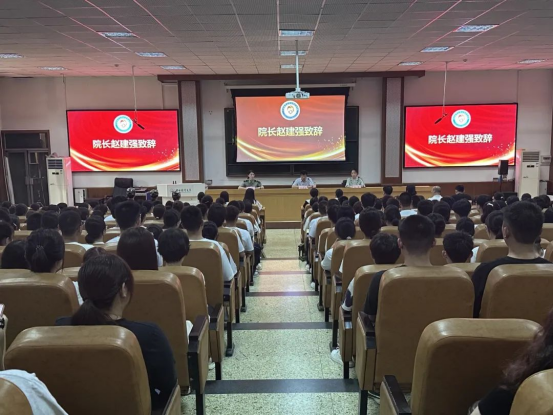 在第三教学楼C201举行2024级新生开学典礼暨军训动员大会。院长赵建强、党委副书记陈玲、副院长孙茜出席,会议由孙茜主持。