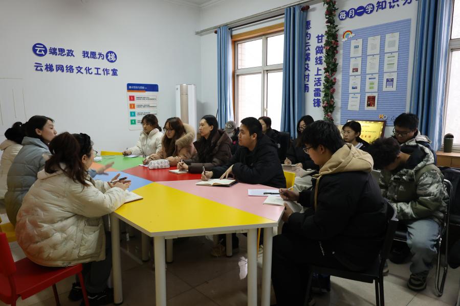 在第二办公楼433召开本学期末考风考纪动员会,学院党委副书记陈玲、副院长孙茜、团委副书记王欣以及各班学习委员参会。