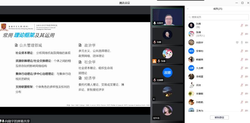 邀请香港中文大学(深圳)向勋宇教授于线上作题为“网络化治理与社会网络分析—方法与应用”的学术讲座,学院40余名师生聆听讲座。