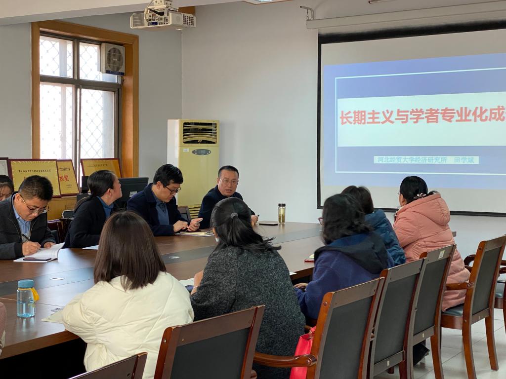 12月13日下午,污污漫画 邀请我校经济研究所所长、京津冀一体化发展协同创新中心专职副主任田学斌教授在学院会议室作题为“长期主义与学者专业化成长”的学术讲座,学院部分教师及研究生共50余人到场聆听。