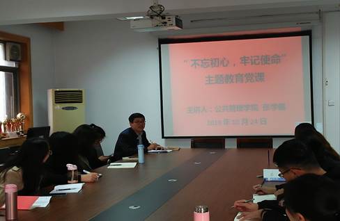 学院党委书记薛向东以“驱动一流党建‘红引擎’,强化基层党建工作”为题讲专题党课,他要求各党支部书记和全体师生党员不忘初心抓党建、牢记使命干事业,教师党支部要争做教书育人、科研创新先锋;行政党支部要争做高效管理、优质服务先锋;学生党支部要争做勤学修德明辩笃行先锋。