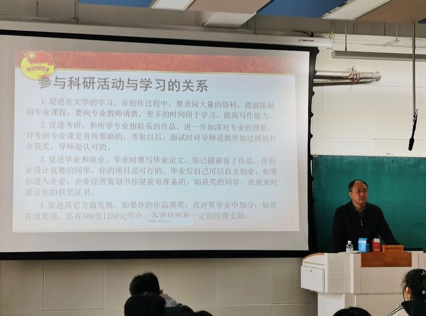 动员会伊始,薛向东展示活动一览表,为同学们介绍了丰富的课外竞赛活动。随后,薛向东以“早动手、立项新、勤学习、多实践”四个注意事项作为切入点,介绍了科研活动与大学生学习两者是相辅相成的关系,重点强调了科研活动在促进大学生学习、考研、毕业和就业以及其他方面发展具有重要意义,并介绍了如何制定创业计划以及开展创业活动。最后,薛向东勉励各位同学要主动参加科研创业竞赛、积极投身科研创新活动。