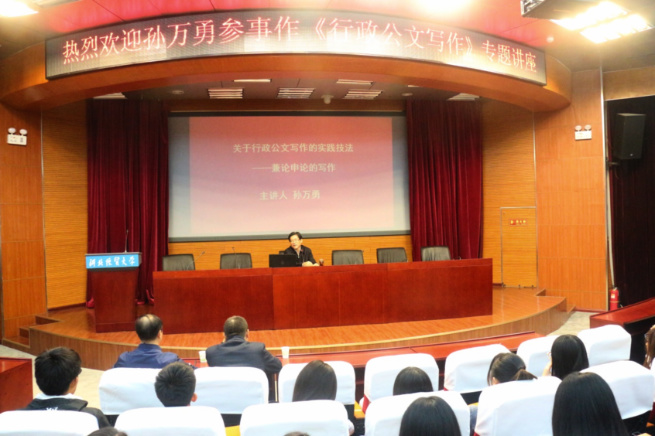 孙万勇部长从公文属性与特性、写作者应具备的能力、公文写作存在的主要问题及写作过程管理四个方面进行讲解。他向在场学生介绍了讲话、总结、报告、意见、规定等文种有关实践技法的问题。孙万勇部长强调公文写作者应具备调查研究、科学思辨、提炼概括、文字表达和学习提高这五种能力,做到心中有民生,笔下有听众。他指出,同学们一定要进行大量的实践,通过理论与实践的融会贯通,才能不断熟悉和掌握写作规律和特点,才能使写作者驾轻就熟。讲座内容充实,信息量大,同学们纷纷表示受益颇多。