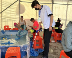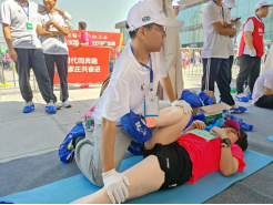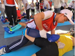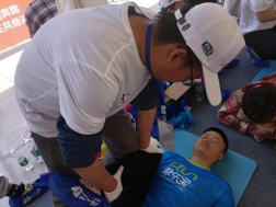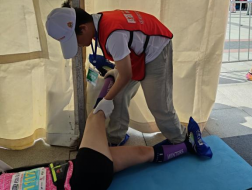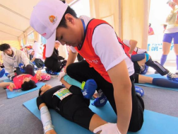 志愿者在第三小组对陆续抵达的选手们进行拉伸放松服务,帮助选手们缓解疲劳、恢复体能。经过三个小时的连续服务,赛后恢复工作圆满完成。